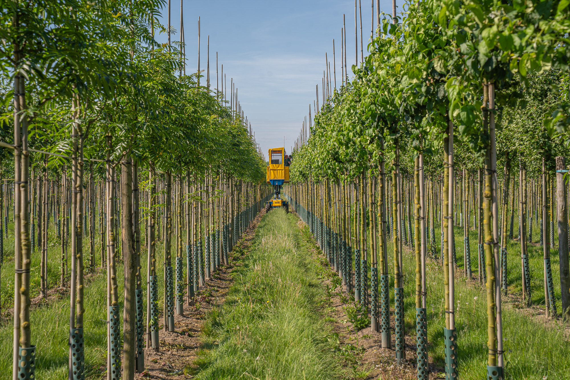 De werkzaamheden op een laanboomkwekerij zijn divers en afwisselend, dit komt voornamelijk doordat we werken met de seizoenen. In het voorjaar worden jonge bomen geplant en aangebonden. Ook zijn we dan nog druk de laatste leveringen in orde te maken. In de zomerperiode bestaat het werk voornamelijk uit het stammen opschonen, doorbinden van bomen en zomersnoei. Dit werk doen we op een hoogwerker, tussen de boomkronen, met een muziekje op. Mooier gaat het niet worden! Dit alles aangevuld met algemene kwekerijwerkzaamheden als machinale onkruidbestrijding (wieden en maaien) en watergeven bij droogte.